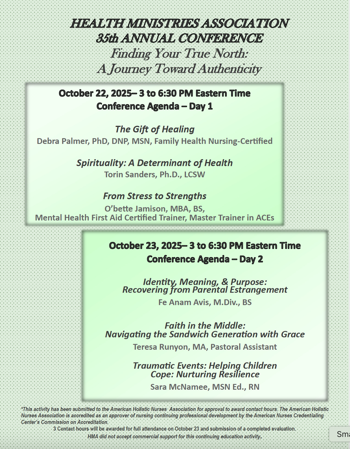 True North-that inner compass that leads to a life of purpose, balance, and fulfillment. Presenters will explore the concept of the authentic self, including understanding who we are mentally, physically, and spiritually with special emphasis given to the spiritual determinants of health and spiritual healing.